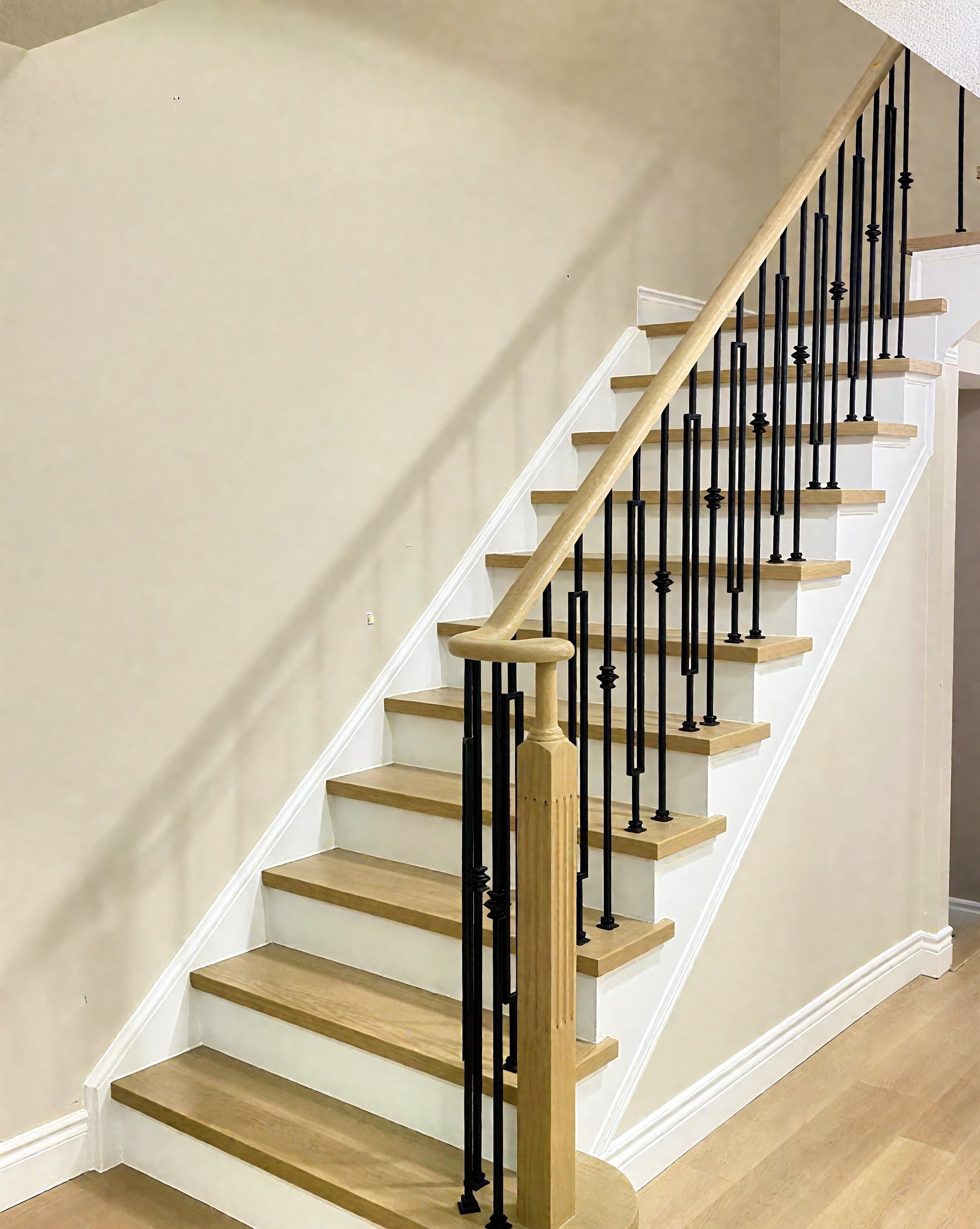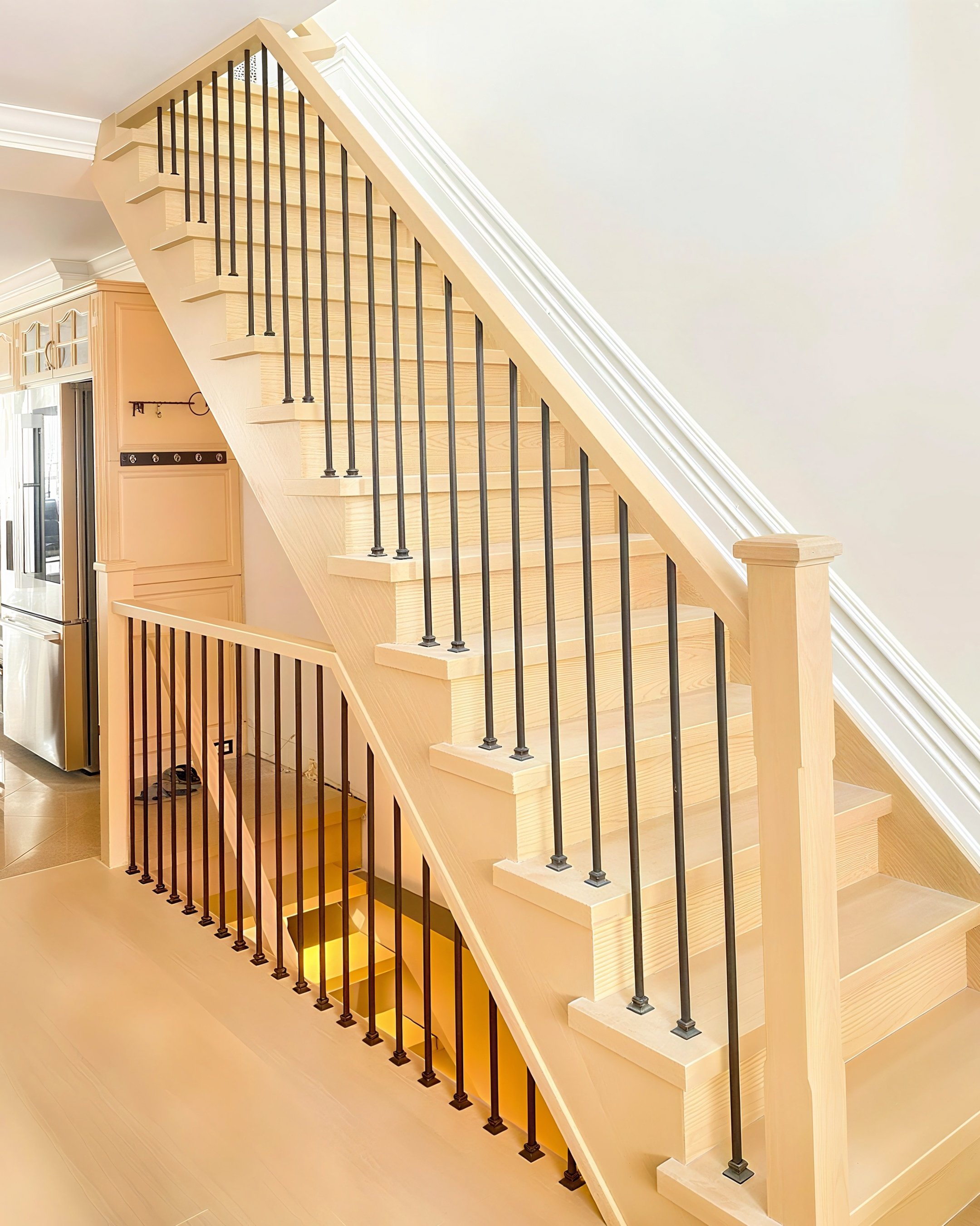 Stair refresh includes staining the existing stair and hand rail and replacing the railing!